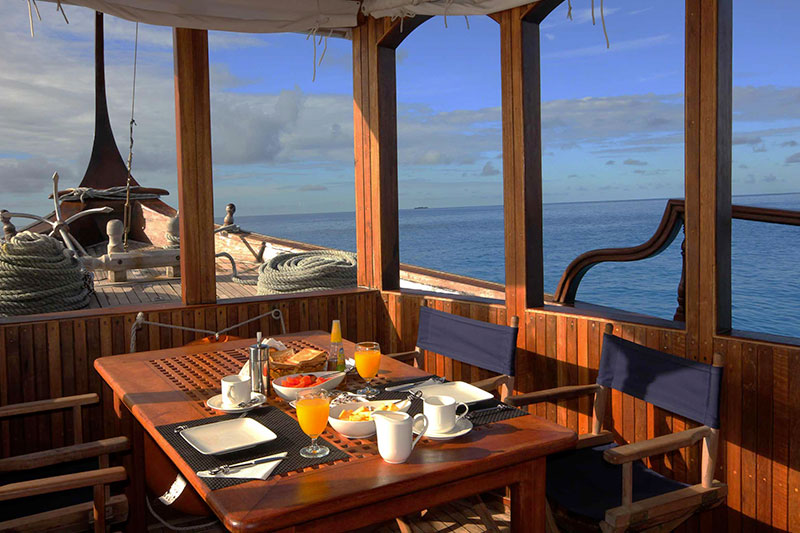 The dining experience on board Dhoni Stella allows you to enjoy a terrace on the sea in the most comfortable and luxury setting, whether it be open to the fresh air and sun, shaded by the curtains or sheltered by canvas. Dhoni Stella's kitchen boasts some of the best Asian-Fusion dishes on the waters of the Maldives and our crew brings you the best of the best restaurant experiences in the islands.