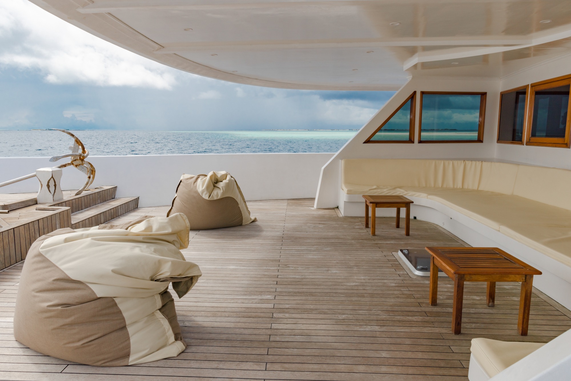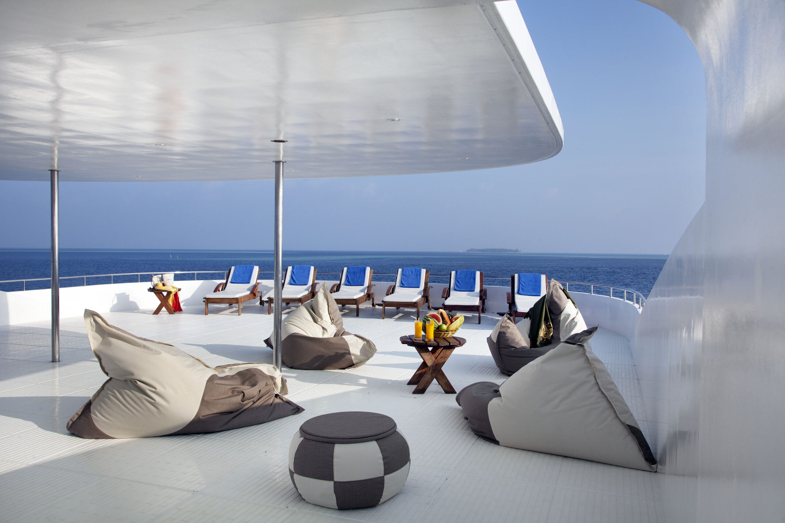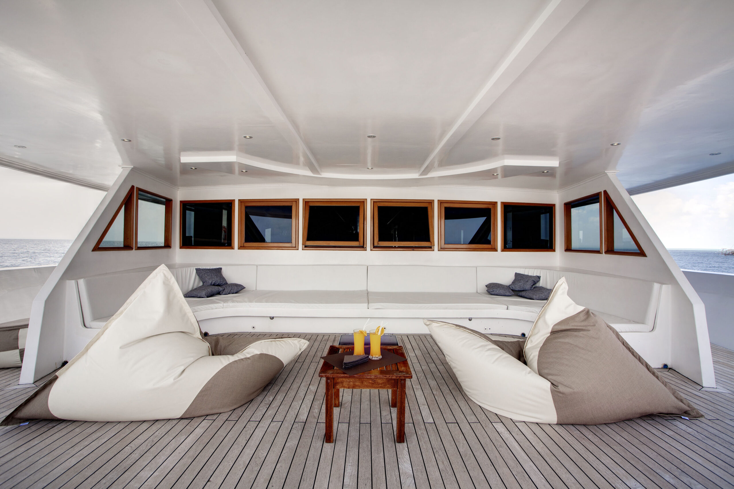 The common open-air spaces are on three decks and offer large areas furnished with sun loungers, cushions and sun mats, both in the shade and in the sun. The decks allow guests to enjoy the breathtaking Maldivian scenery, both when sailing and while relaxing when the yacht is moored in the lagoons for the night.