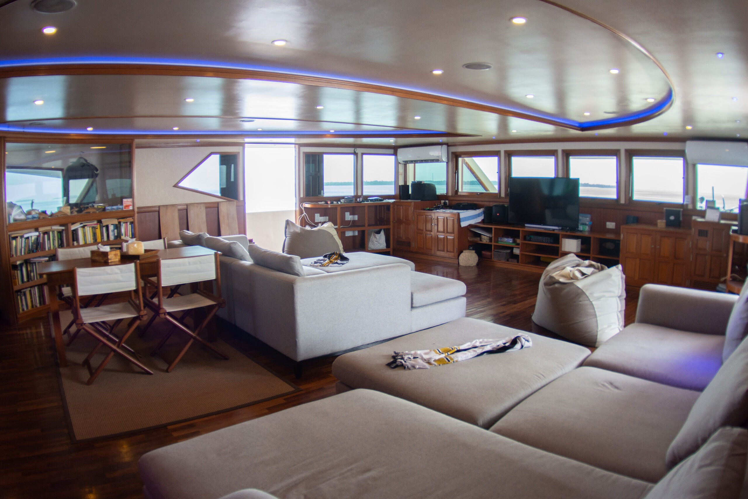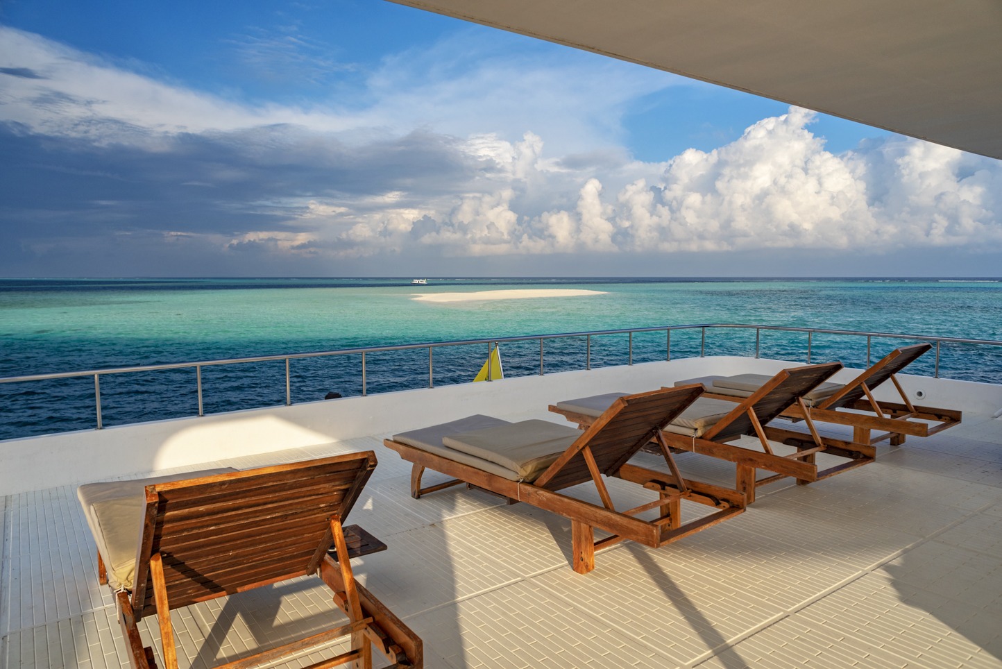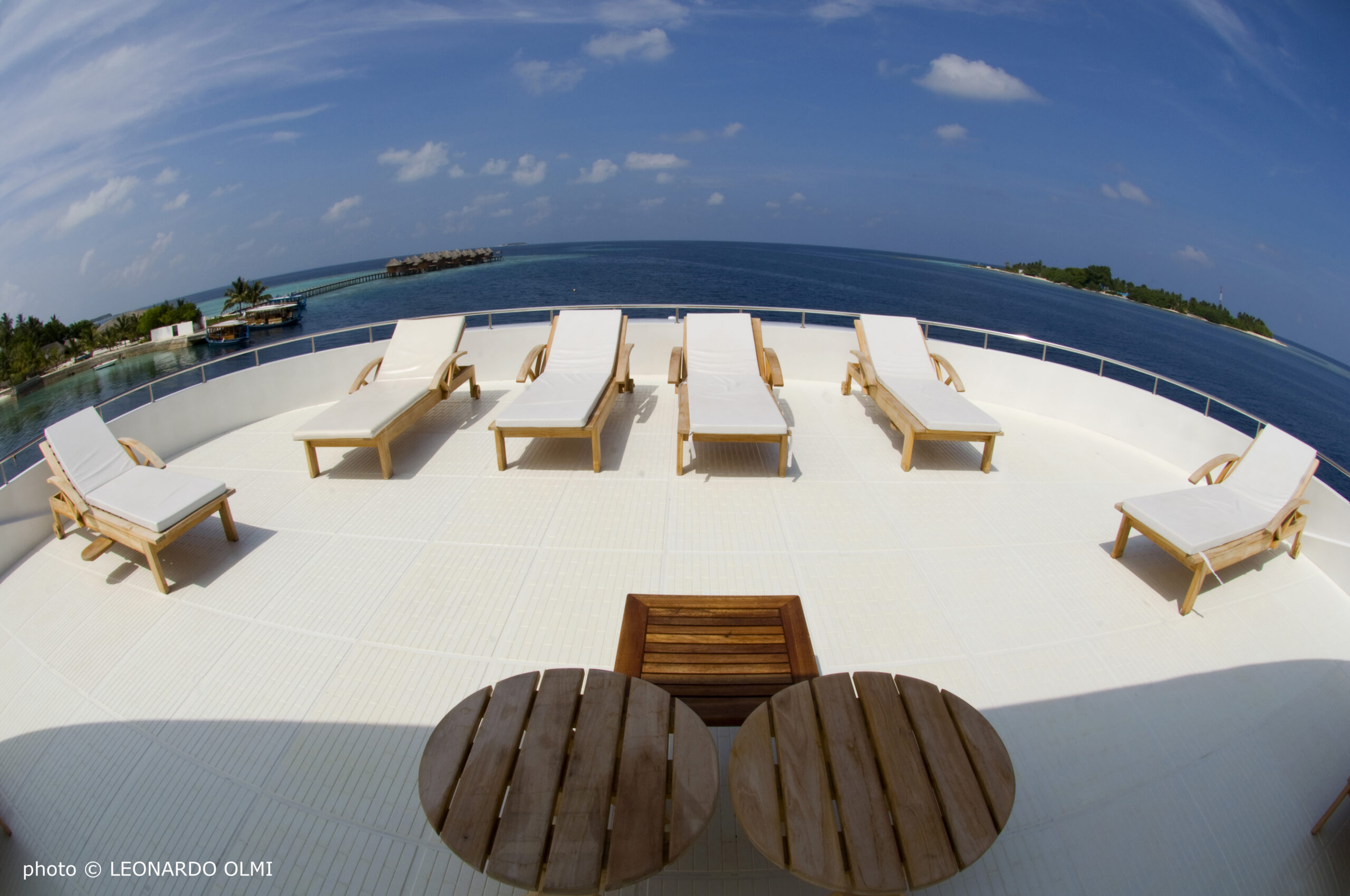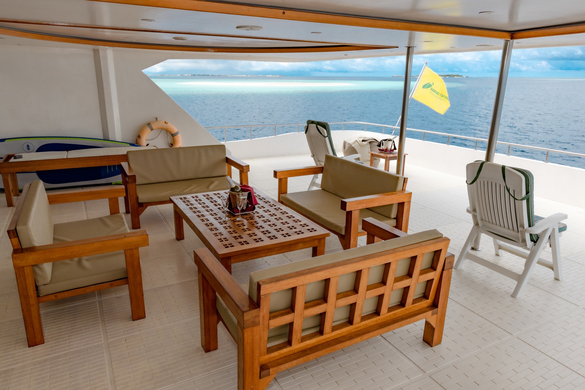 The common open-air spaces are on three decks and offer large areas furnished with sun loungers, cushions and sun mats, both in the shade and in the sun. The decks allow guests to enjoy the breathtaking Maldivian scenery, both when sailing and while relaxing when the yacht is moored in the lagoons for the night.