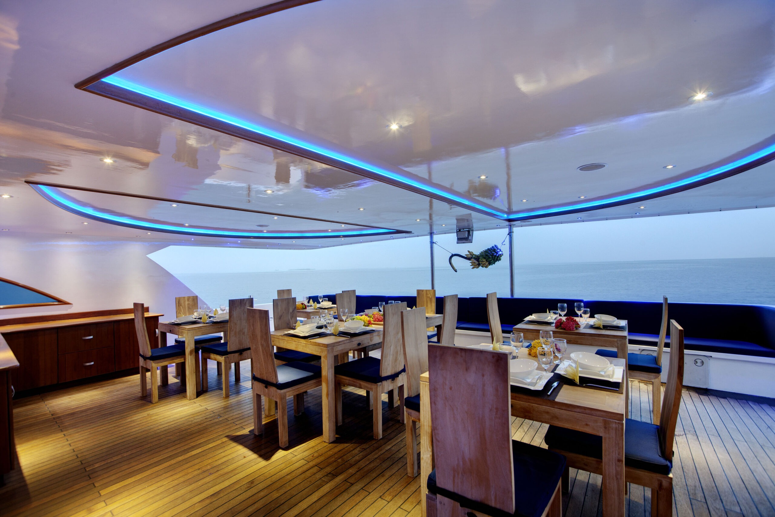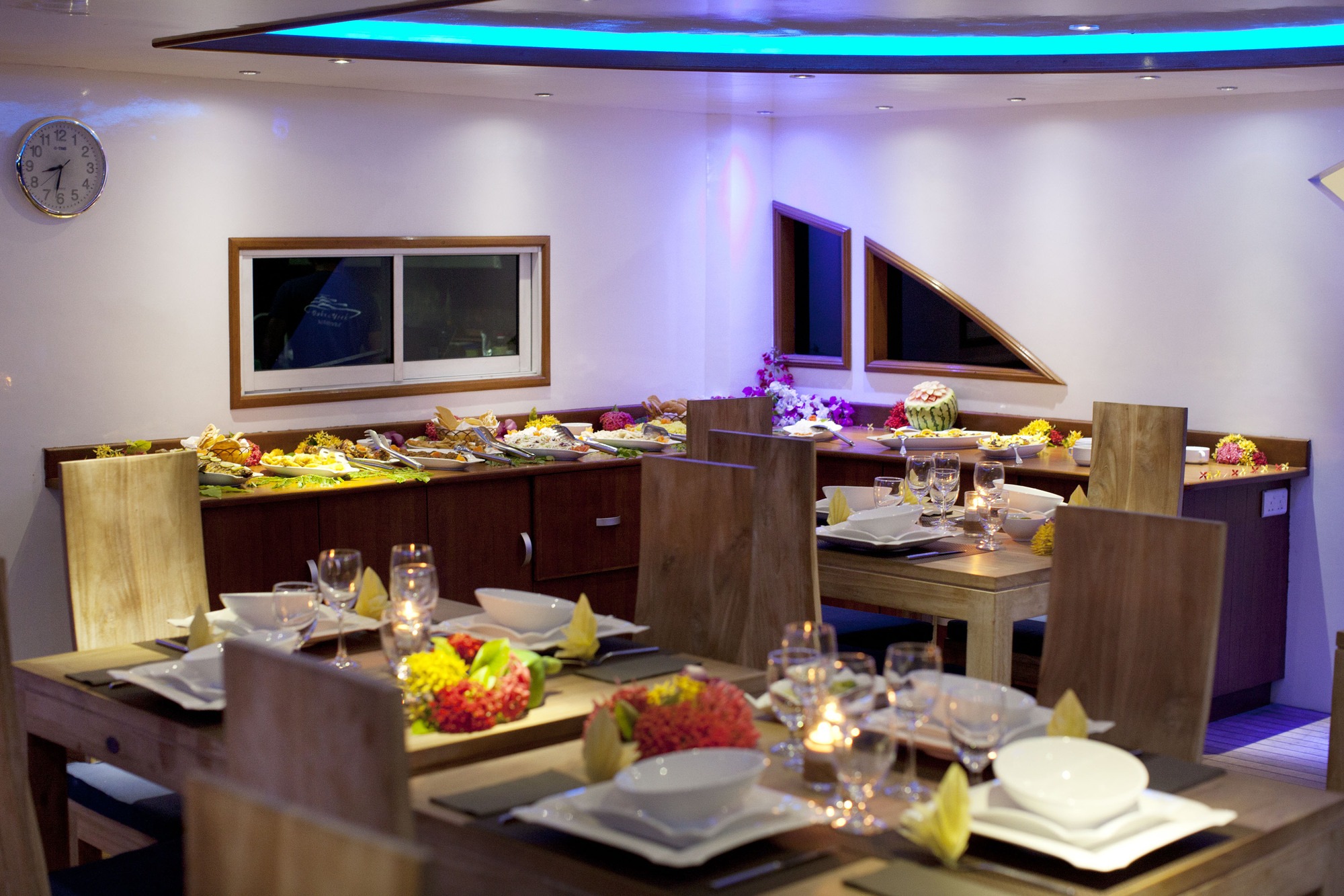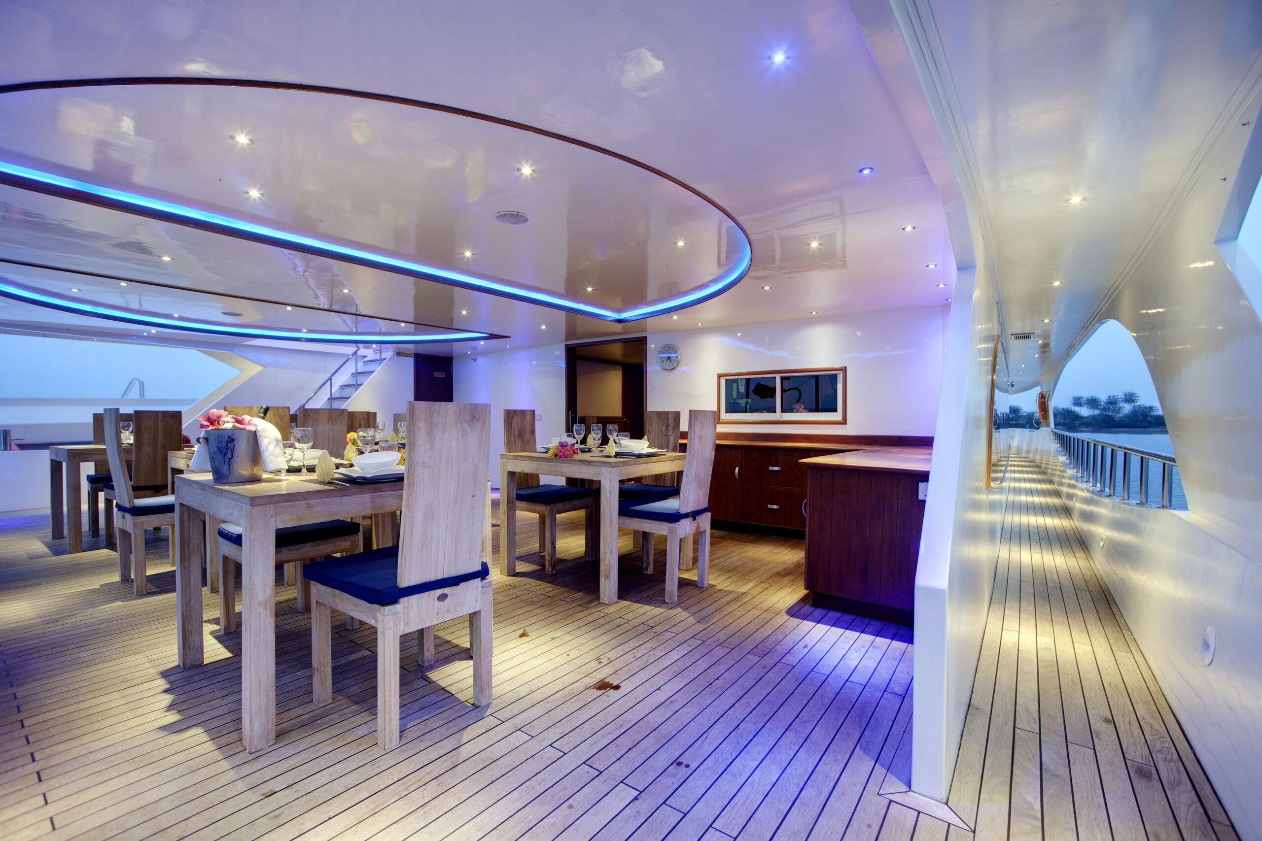 The very spacious outdoor dining area (aft of first deck) is furnished with tables and chairs made of quality wood and can easily accommodate 24 guests. The area is wholly shaded and can be covered to allow outdoor dining even in case of rain. Meals are served as buffets and menu include dishes from the International, Italian and Maldivian cuisine, mainly prepared with fresh fish, although our chefs are always ready to satisfy any of our guests specific needs.