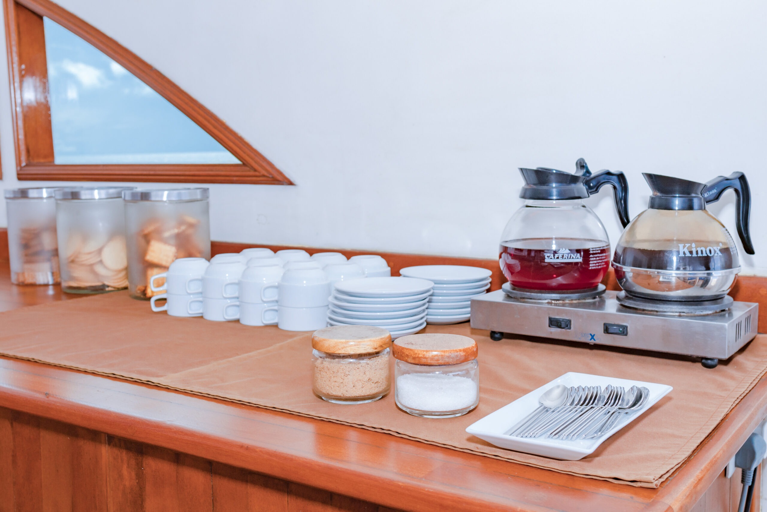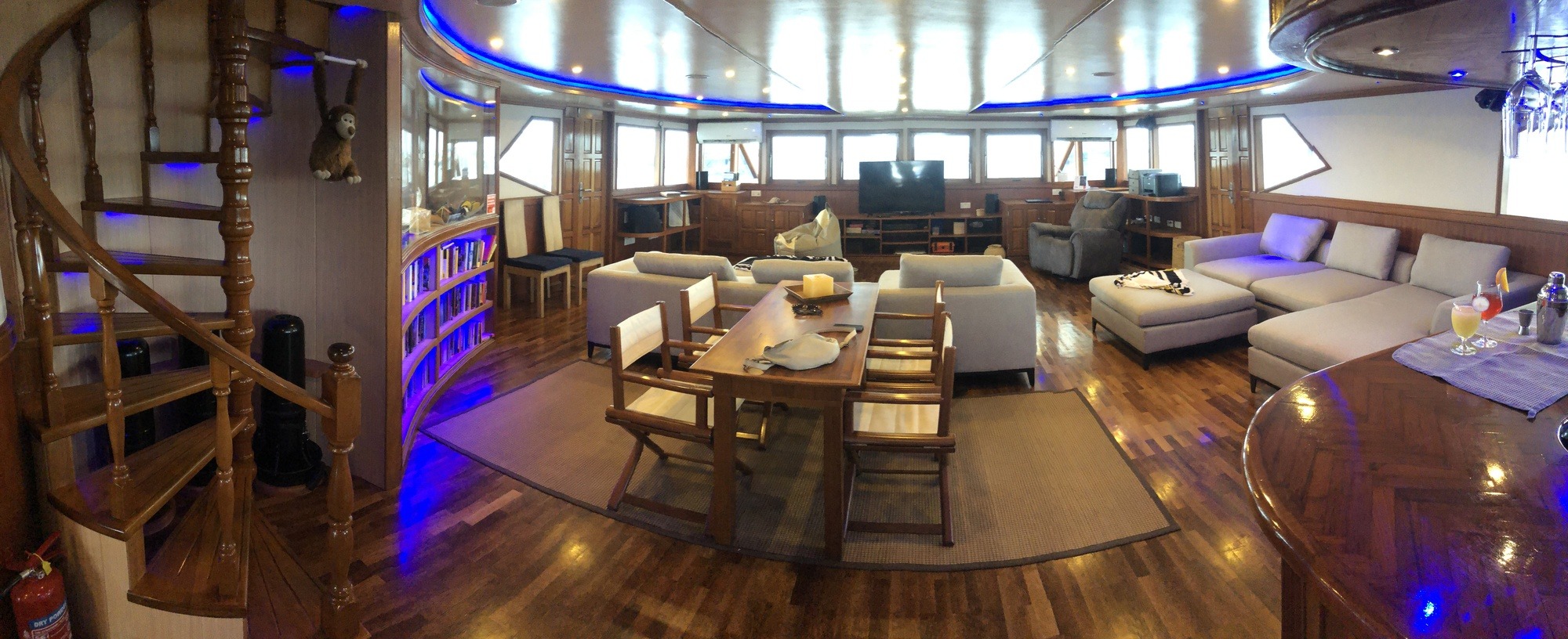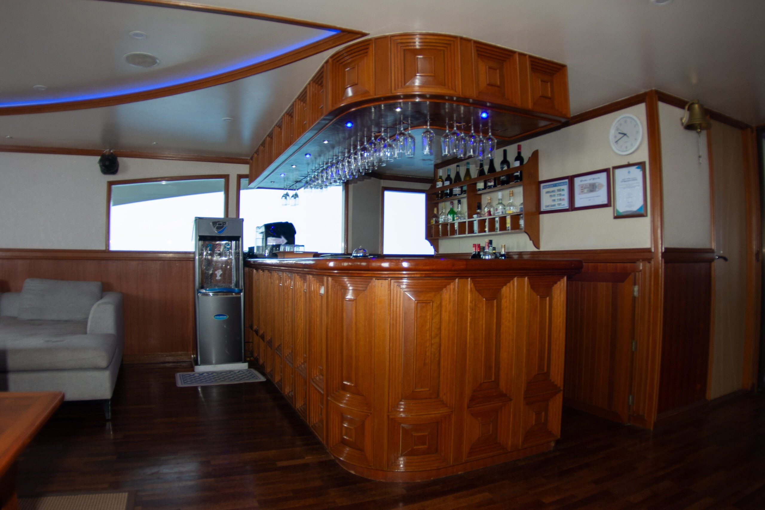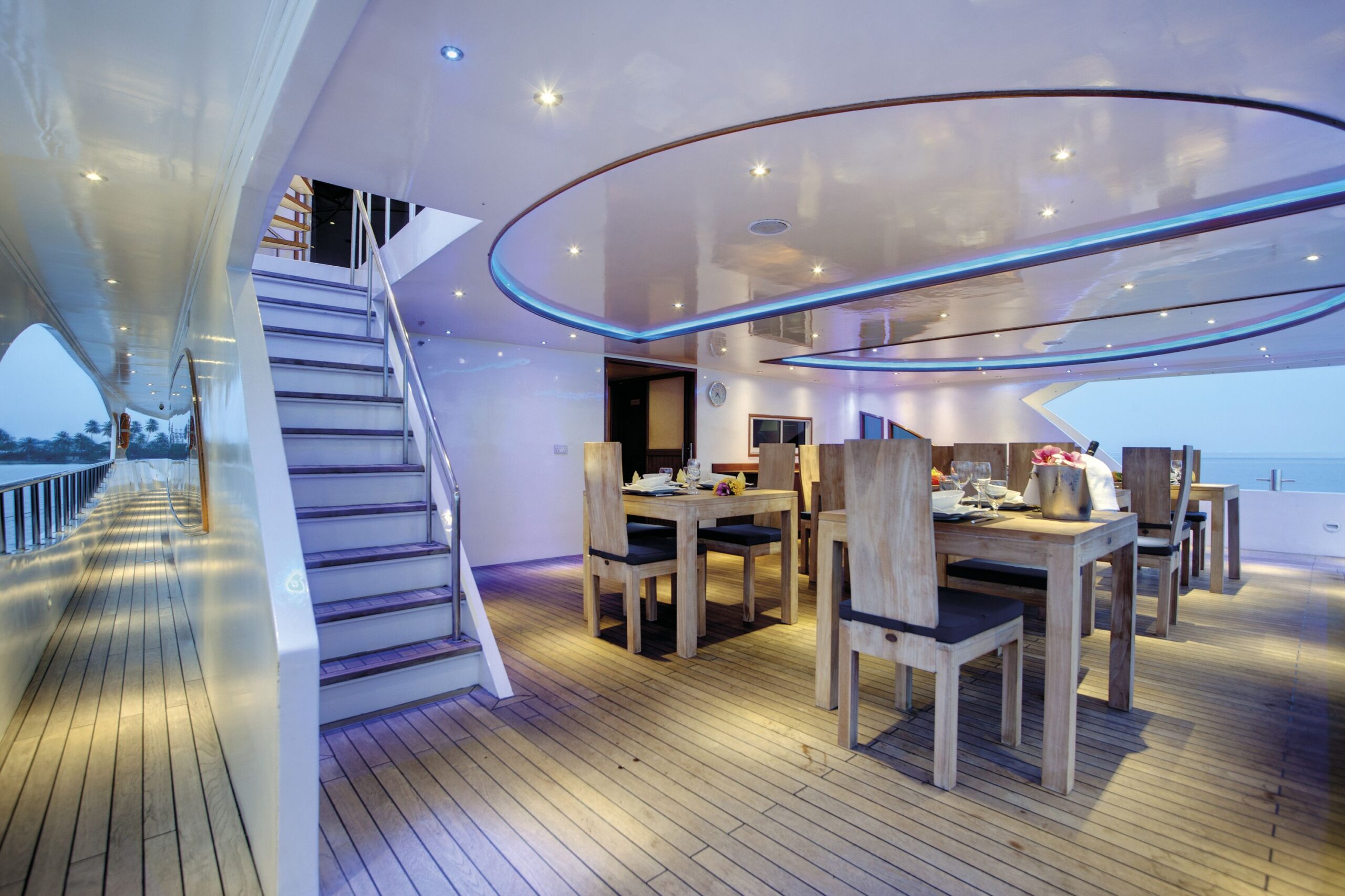 The very spacious outdoor dining area (aft of first deck) is furnished with tables and chairs made of quality wood and can easily accommodate 24 guests. The area is wholly shaded and can be covered to allow outdoor dining even in case of rain. Meals are served as buffets and menu include dishes from the International, Italian and Maldivian cuisine, mainly prepared with fresh fish, although our chefs are always ready to satisfy any of our guests specific needs.