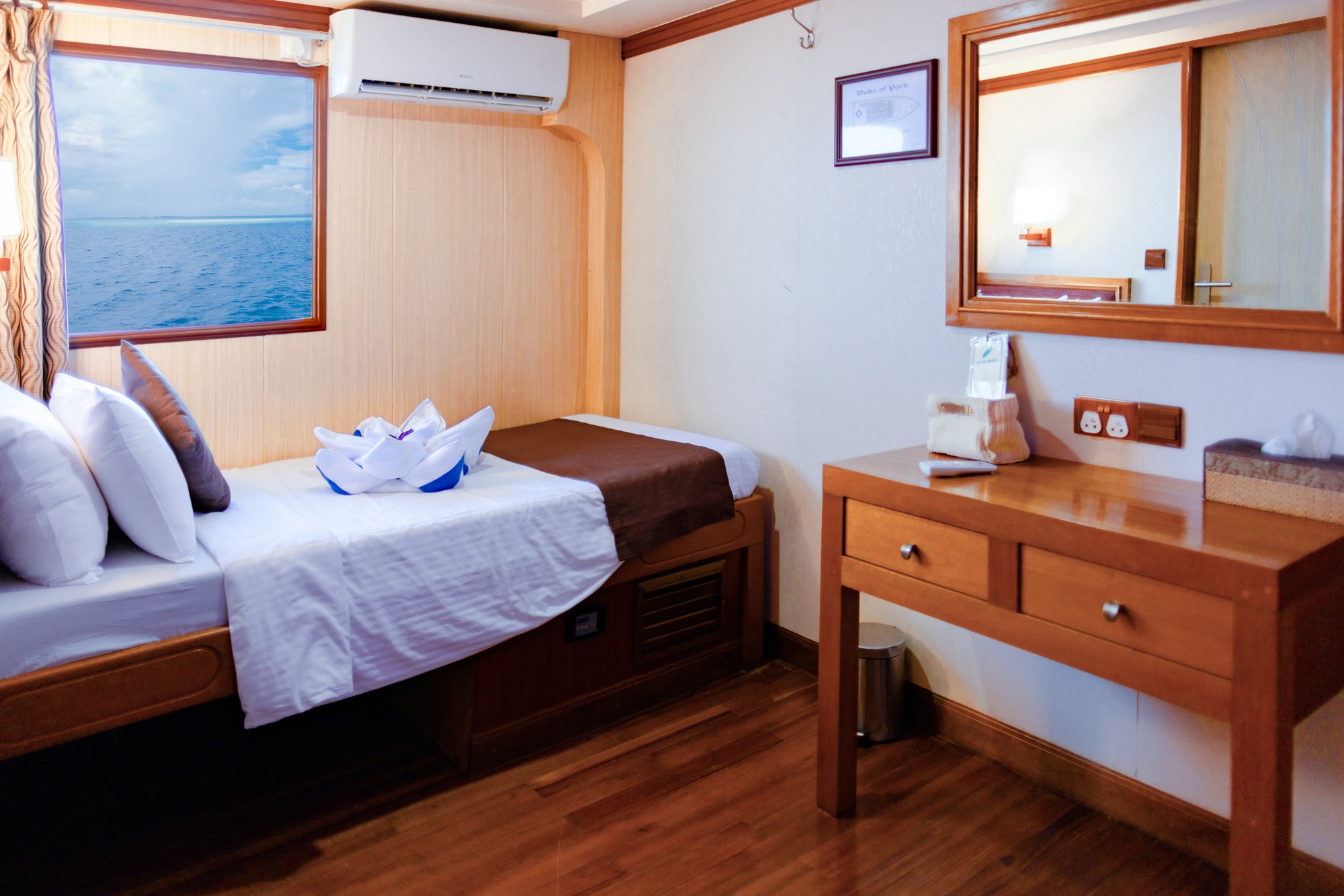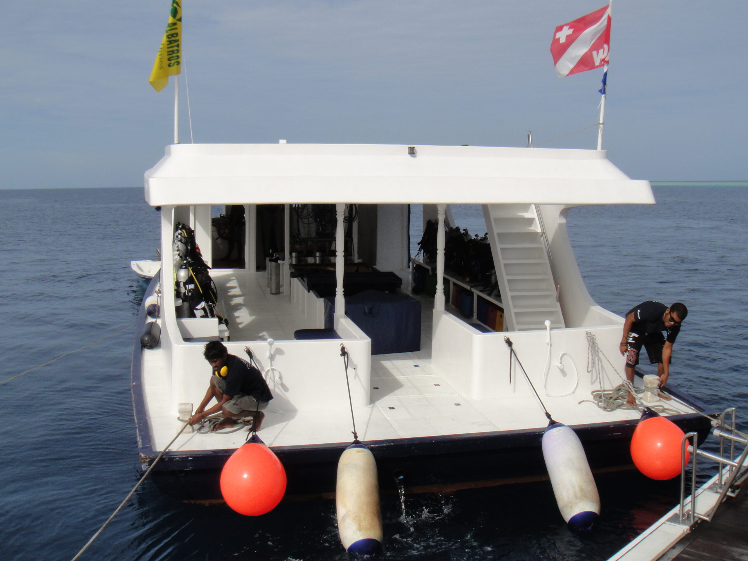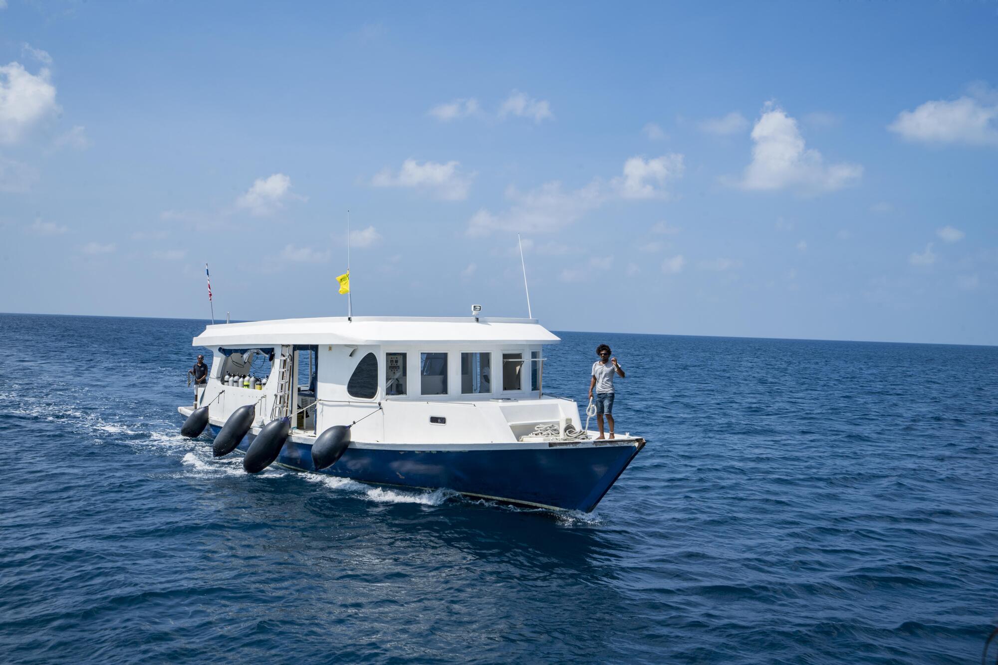 The 36-meters long and 11-meters wide DUKE OF YORK boasts 4 levels with indoor parquet flooring and teak on the main deck, is accompanied by a comfortable DHONI used for diving, snorkeling, fishing, marine activities and to land on sand banks/desert islands. Along with the more traditional diving techniques we are able to offer cruises with the assistance and material to dive with REBREATHERS.