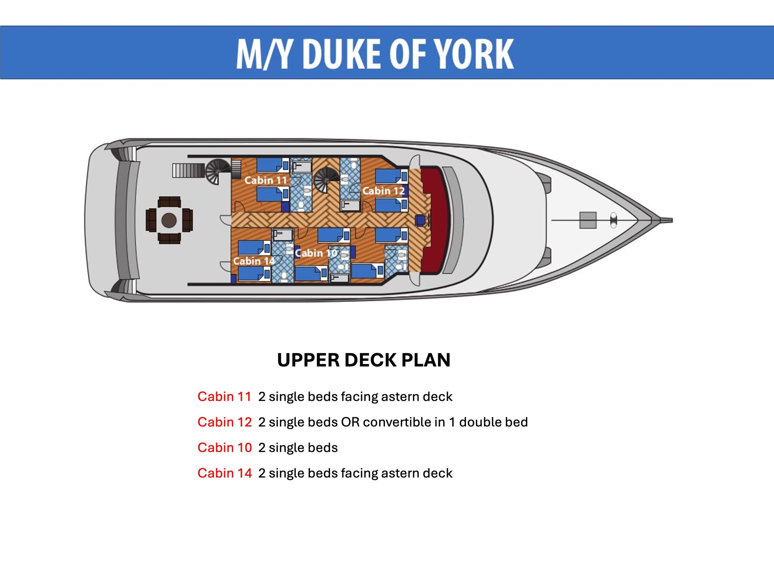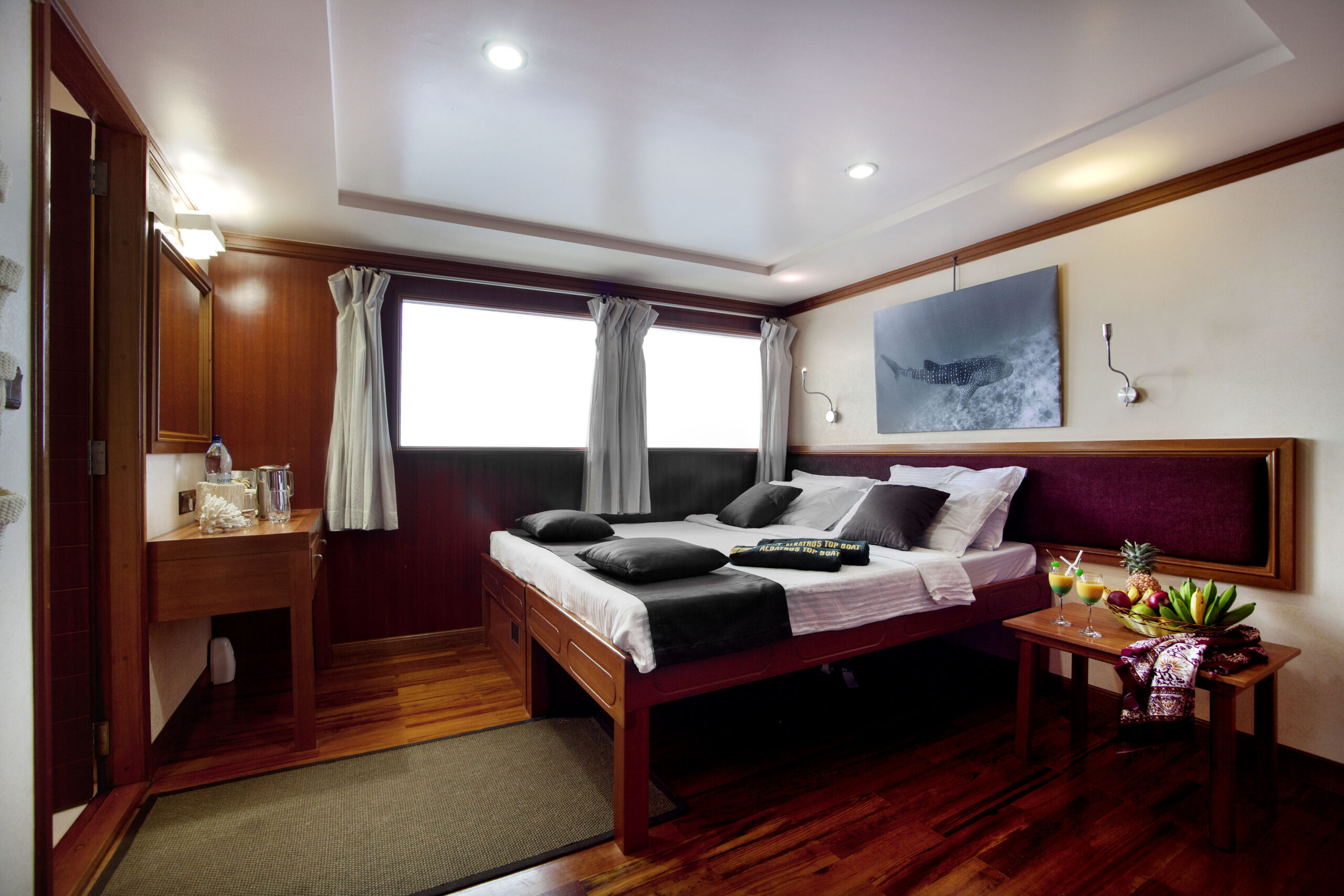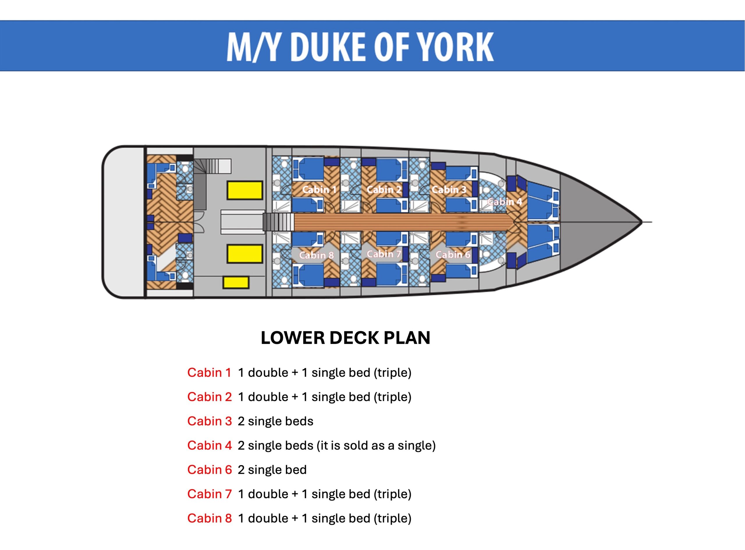 The 36-meters long and 11-meters wide DUKE OF YORK boasts 4 levels with indoor parquet flooring and teak on the main deck, is accompanied by a comfortable DHONI used for diving, snorkeling, fishing, marine activities and to land on sand banks/desert islands. Along with the more traditional diving techniques we are able to offer cruises with the assistance and material to dive with REBREATHERS.