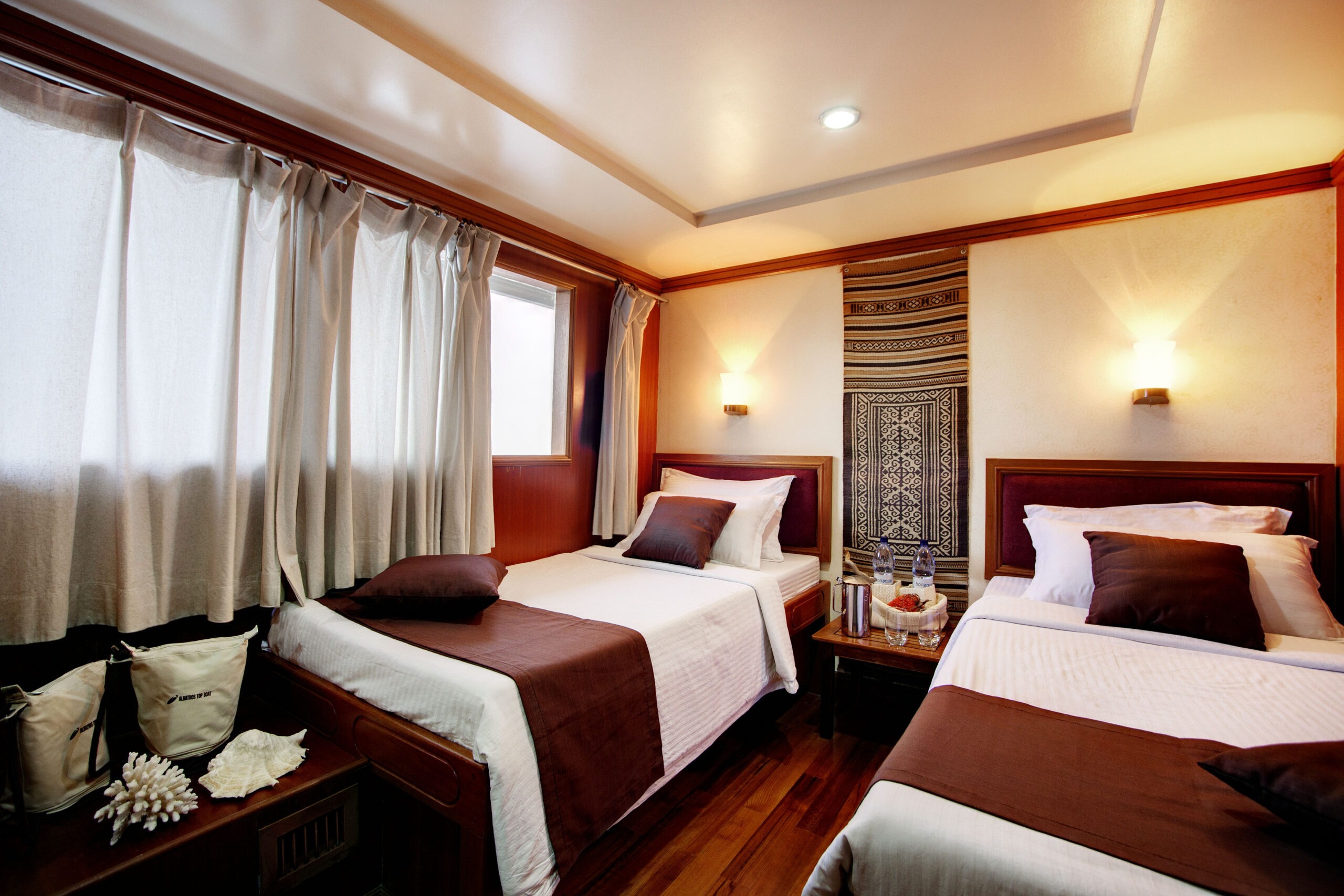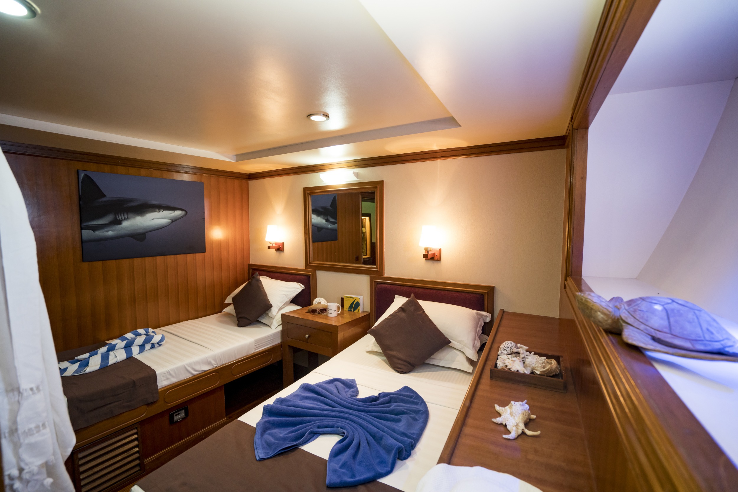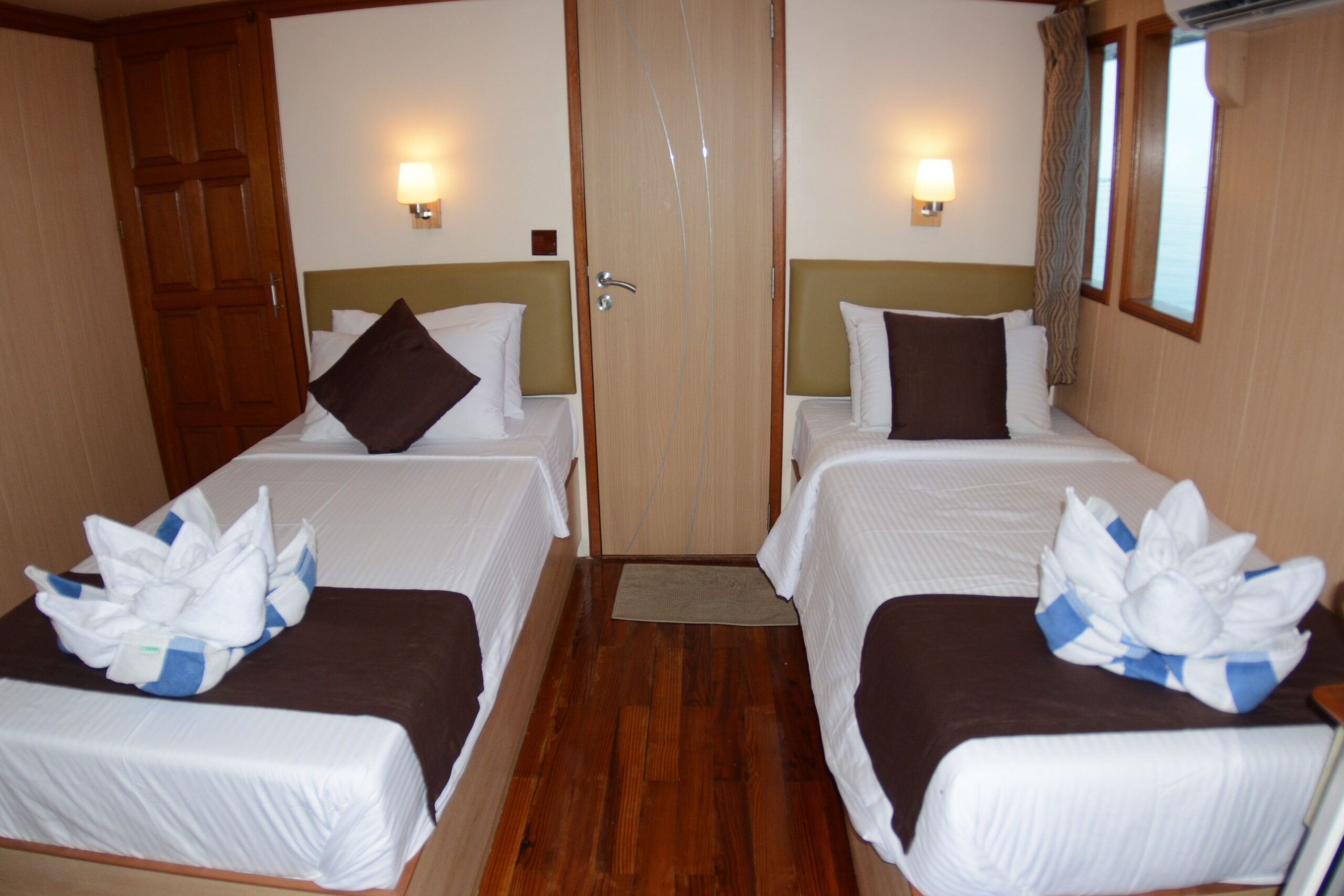 1 double with twin beds with wide glass window overlooking the stern of the second deck