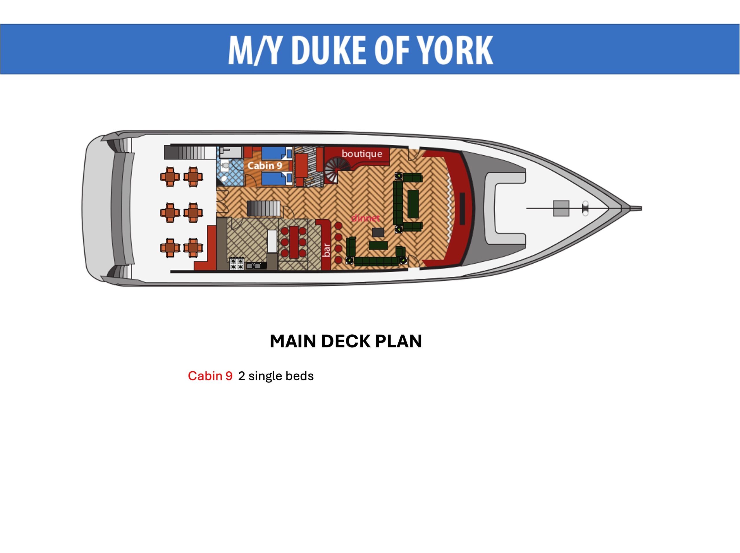 The large air-conditioned indoor saloon of the Duke of York has a bar offering a wide choice of soft drinks and spirits and 2 comfortable sofas, which become a meeting and relaxing place for those wishing to listen to music, watch a movie or read a book. Occasionally, for special evenings, thanks to its Dolby Surround TV-Stereo system the saloon even turns into a dancefloor. Recharging area for cameras -220v electricity.
